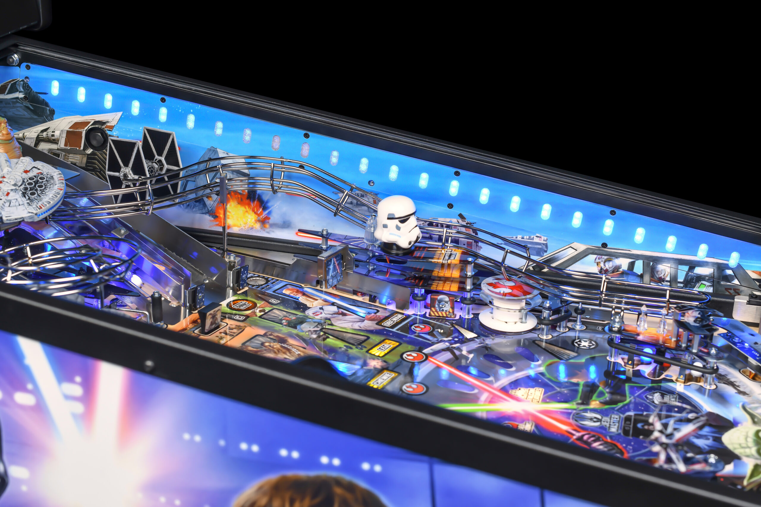 For the Premium Edition, get immersed into the world of Star Wars with the Cabinet Expression Lighting System™ accessory. With 96 intelligent RGB LEDs, the Cabinet Expression Lighting System enables full color spectrum control. Positioned in pockets cut into the cabinet sides to provide themed full playfield illumination, this system is synchronized to custom light shows and dynamically responsive to game events while featuring exclusive Battle of Hoth hand-drawn artwork.